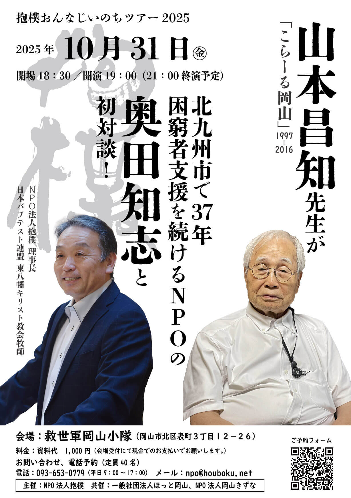 「おんなじいのちツアー2025」と題して、抱樸理事長・奥田知志が全国各地を巡る企画の岡山開催講演会です。