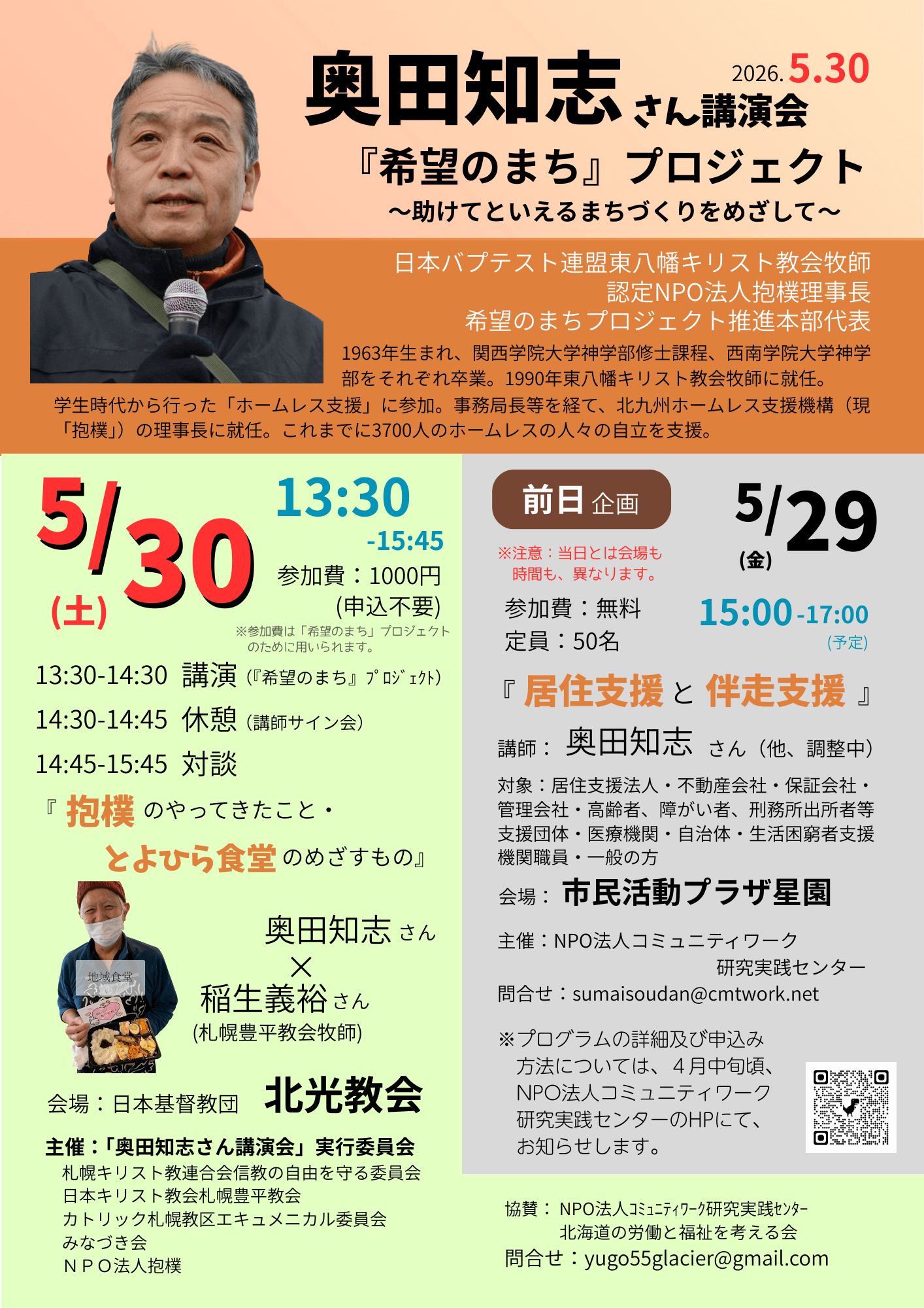 ※前日、5月29日(金)には、NPO法人コミュニティワーク研究実践センター主催の講演会「居住支援と伴走支援」が別会場(市民活動プラザ星園)で開催され、講師として抱樸理事長・奥田知志が登壇します。